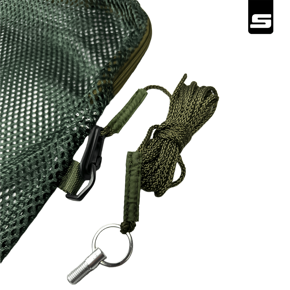 W zestawie znajduje się również sznurek kotwiczący o długości 500 cm z gwintowanym mocowaniem, który pozwala stabilnie przymocować worek do podpórki wędkarskiej, pomostu, drzewa lub innego elementu nad wodą. Dzięki temu możliwe jest bezpieczne przetrzymywanie ryby w wodzie przed ważeniem lub wypuszczeniem.