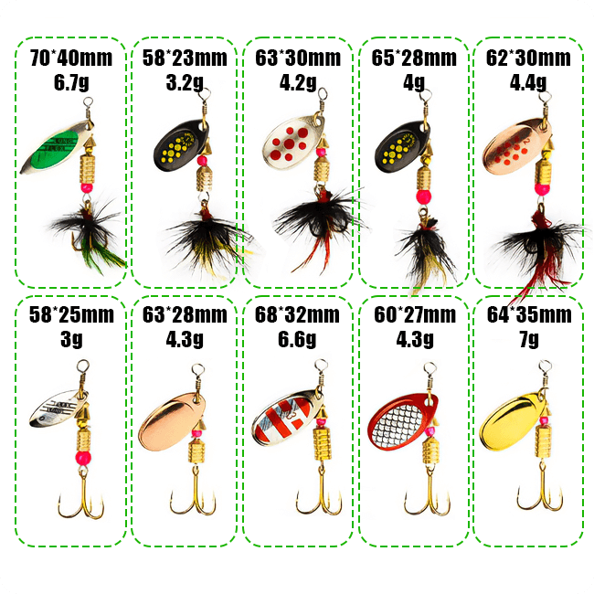 Zestaw obejmuje obrotówki o różnej wadze (3g do 7g), długości (58mm do 70mm) i długości blachy obrotowej (23mm do 40mm). Ta różnorodność umożliwia dostosowanie sprzętu do warunków połowowych oraz preferencji konkretnego gatunku ryb.
