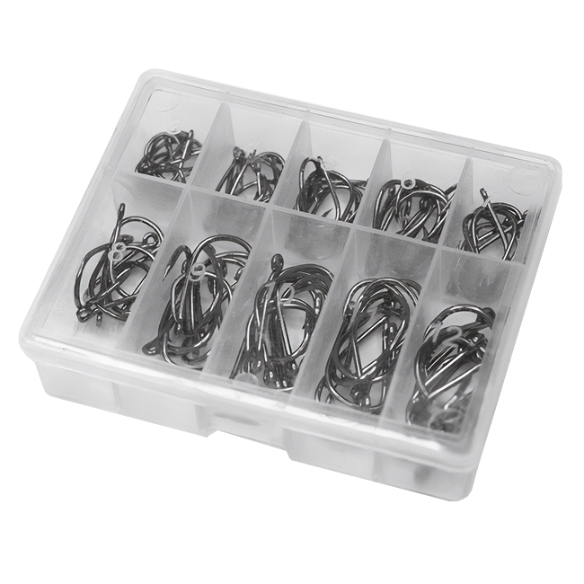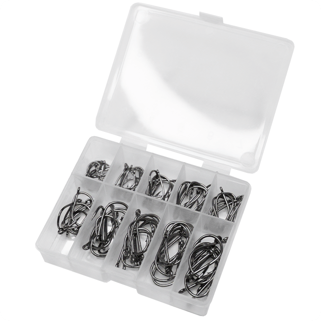 Zestaw zawiera 100 haczyków po 10 z każdego rozmiaru oraz dedykowane pudełko (organizer) z opisanymi numerami.