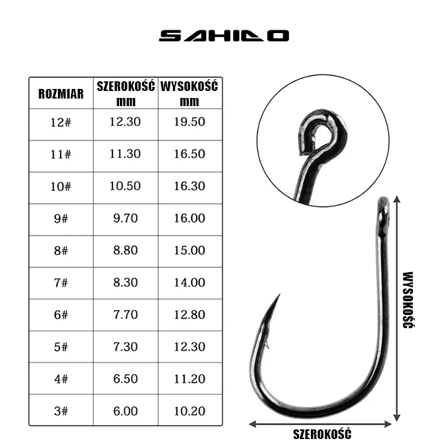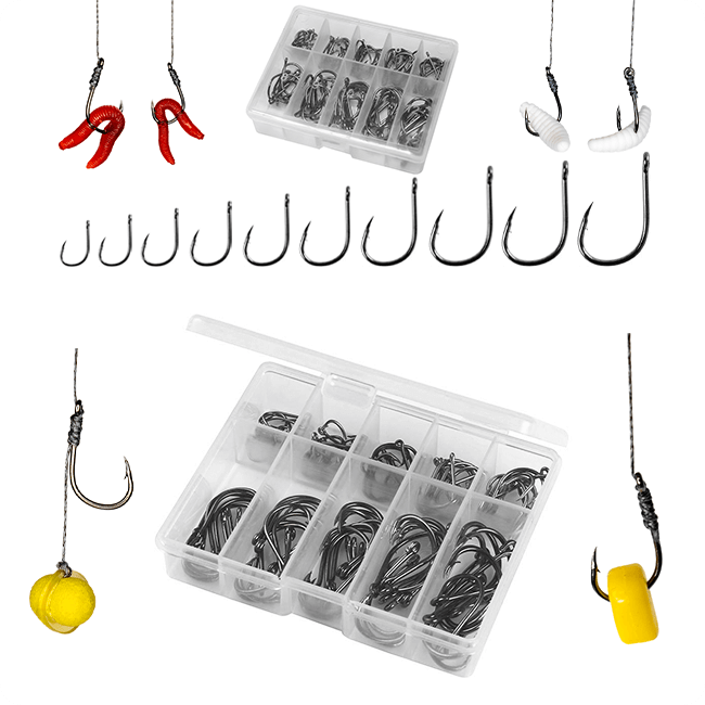 Rozmiary haczyków w zestawie to 3#, 4#, 5#, 6#, 7#, 8#, 9#, 10#, 11#, 12#, przy czym każdego rozmiaru znajduje się 10 sztuk. Ta różnorodność rozmiarów pozwala na elastyczne korzystanie z zestawu zarówno podczas łowienia spławikowego, feederowego, karpiowego, jak i gruntowego.
