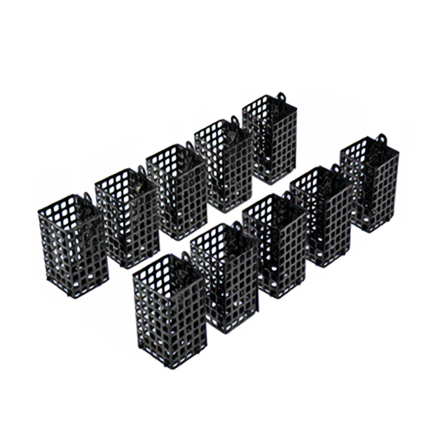 BASKET FEEDER KIT 10 to profesjonalny zestaw 10 prostokątnych koszyków zanętowych o gramaturze 30 g i wymiarach 50x30 mm każdy. Podajnik tego zestawu został precyzyjnie zaprojektowany, z wykorzystaniem wysokiej jakości stali nierdzewnej, co sprawia, że stanowią one niezastąpione narzędzie podczas połowów Feeder/Grunt. Podajnik został zaprojektowany w taki sposób, aby zmaksymalizować efektywność łowienia, kosz dzięki swojej konstrukcji zawsze opada na dno ciężarkiem do dołu.