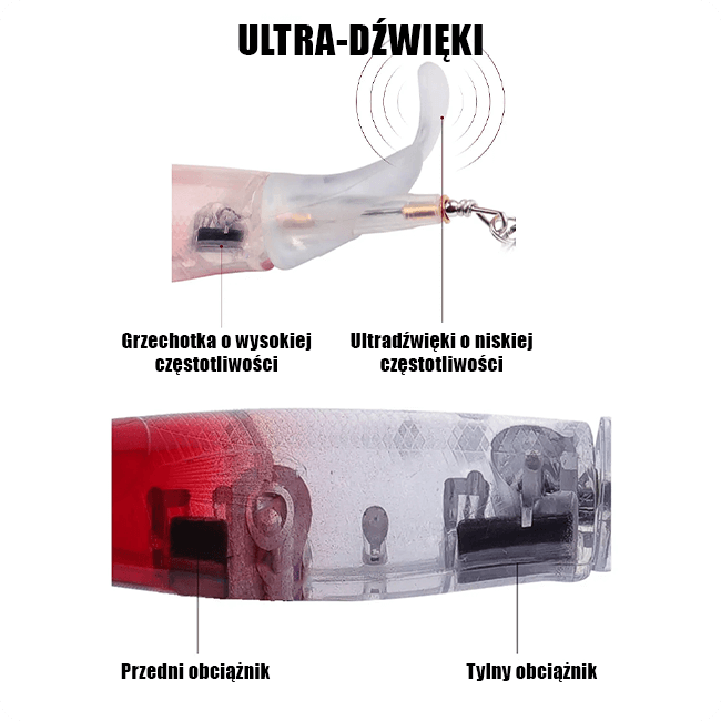 Ruchoma płetwa została zaprojektowana do emisji niskich częstotliwości ultra dźwiękowych, co działa na zmysły ryb, wabiąc je do przynęty. Ten wielowarstwowy efekt dźwiękowy zwiększa skuteczność połowu.